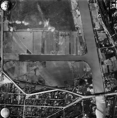 légifotó, Csepel, középen a Francia-öböl. Jobb oldalon a Ráckevei (Soroksári)-Duna és a Gubacsi híd. A felvétel 1944. április 14-én készült.