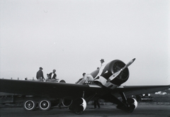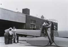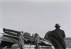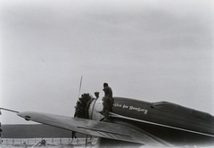 Ford repülőtér, a "Justice for Hungary" névre keresztelt Lockheed Sirius repülőgép. Az Atlanti-óceán átrepülésére készülő gépnél Bánhidi Antal gépészmérnök, repülőgép tervező, a kameránál Endresz György pilóta. Leltári jelzet: 16791