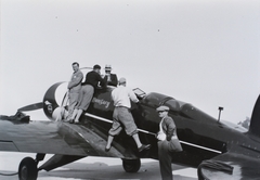 Ford repülőtér, a "Justice for Hungary" névre keresztelt Lockheed Sirius repülőgép. Az Atlanti-óceán átrepülésére készülő Magyar Sándor navigátor és Endresz György pilóta, a kameránál Bánhidi Antal gépészmérnök, repülőgép tervező. Leltári jelzet: 16783