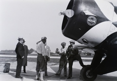 Ford repülőtér, a "Justice for Hungary" névre keresztelt Lockheed Sirius repülőgép. Az Atlanti-óceán átrepülésére készülő Endresz György pilóta (ingujjban). Leltári jelzet: 16797