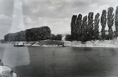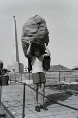 Duna-part, hajóállomás, rakodás egy hajóra. Háttérben a szovjet hősi emlékmű (Sinkó András, 1945.). Leltári jelzet: 30620