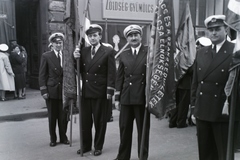 Apáczai Csere János utca 13. és jobbra a 11. szám, a MESZHART (később MAHART) Igazgatóság épülete. A hajótársaság tisztjei készülődnek a május 1-i felvonulásra. Leltári jelzet: 30623.