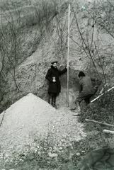 löszfal helyreállítását és megerősítését irányító vasúti mérnök mérőpóznával a település térségében, az 1914. május 11-én történt földcsuszamlást és vasúti balesetet követően. Leltári jelzet: MMKM TFGY 2017.6.26