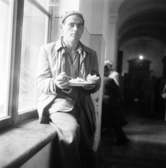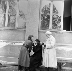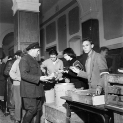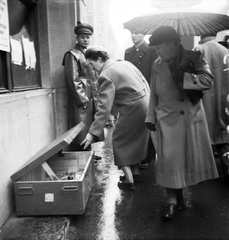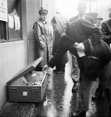 Kossuth Lajos utca, a Károly (Tanács) körút sarkán lévő Gyógyszertár ablaka előtt. Pénzgyűjtés az utcán, az őrizetlen ládát a Magyar Írók Szövetsége helyezte ki.