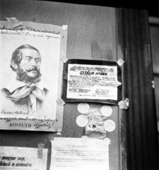 a Kossuth Lajos utca - Károly (Tanács) körút sarkán lévő Gyógyszertár ablaka, Röplapok a Magyar Írók Szövetsége által kihelyezett őrizetlen pénzgyűjtő ládánál.
