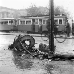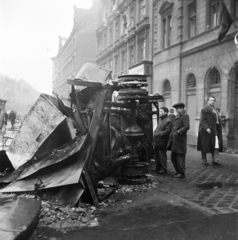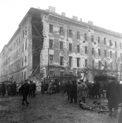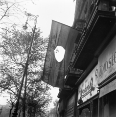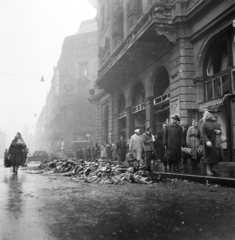 Kossuth Lajos utca a Semmelweis utca felé nézve, elégetett könyvek a Magyar Szovjet Társaság Országos Központja előtt (korábban Országos kaszinó, később a Szovjet Kultúra és Tudomány Háza, majd Magyarok Háza).