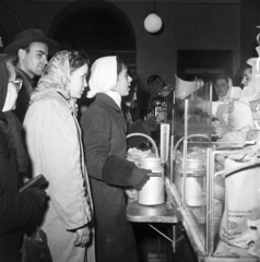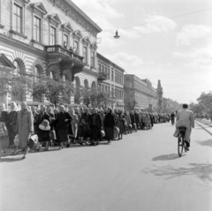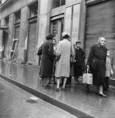 sorban állók a Krúdy utca - Rökk Szilárd utca sarkán lévő KÖZÉRT ellőtt, a felvétel a József körút közelében készült.