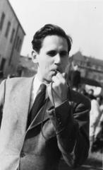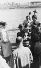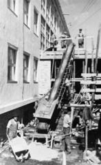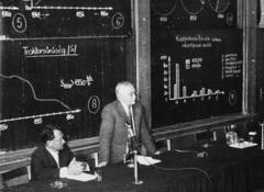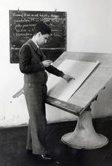 Polinszky Károly vegyészmérnök adjunktus, majd Kossuth-díjas, oktatáspolitikus, a Magyar Királyi József Nádor Műszaki és Gazdaságtudományi Egyetem (később Budapesti Műszaki és Gazdaságtudományi Egyetem) CH / Kémiai épületének helyreállítási tervrajzát nézi.