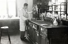 a Magyar Királyi József Nádor Műszaki és Gazdaságtudományi Egyetem (később Budapesti Műszaki és Gazdaságtudományi Egyetem) CH / Kémiai épületének helyreállított laboratóriumában Henszelmann Frigyes vegyészmérnök.