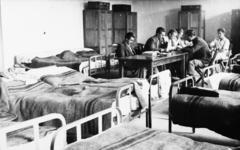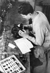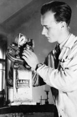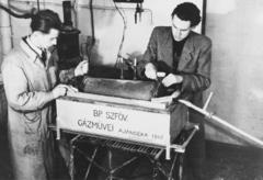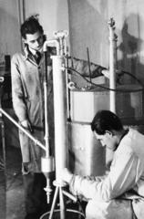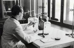 a Magyar Királyi József Nádor Műszaki és Gazdaságtudományi Egyetem (később Budapesti Műszaki és Gazdaságtudományi Egyetem) CH / Kémiai épületének helyreállított laboratóriumában, egy adományozott berendezés beállítása folyik.