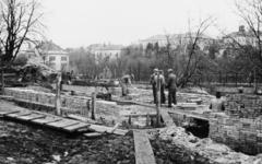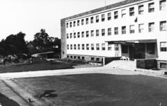 Egyetem (Schönherz Zoltán) utca, az egyetemi oktatók lakásának építkezése, háttérben balra a Megyei Múzeum (később Laczkó Dezső Múzeum), jobb szélen a Veszprém Megyei Tanács Kórházának épületei.