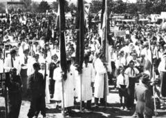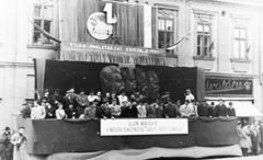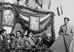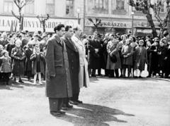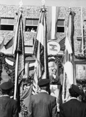 Szabadság tér 1., május 1-i ünnepség dísztibünje a Kapuváry-ház (ekkor Tanácsháza) előtt.
