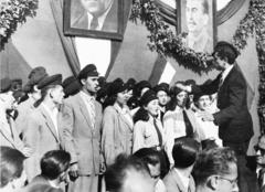 a Budapesti Műszaki Egyetem Veszprémre kihelyezett nehézvegyipari karának megnyitó ünnepsége 1949 október 16-án (később Veszprémi Vegyipari Egyetem, majd Pannon Egyetem). Kossa István pénzügyminiszter tart beszédet.