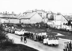 Egyetem (Schönherz Zoltán) utca, a Veszprémi Vegyipari Egyetem dolgozói és hallgatói a május 1-i felvonuláson. Az üres területre épült később, a kórház rendelőintézete.