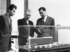 Veszprémi Vegyipari Egyetem (később Pannon Egyetem). Jobbra dr. Polinszky Károly vegyészmérnök rektor, későbbi Kossuth-díjas, oktatáspolitikus az egyetem új diákszállójának makettjével.