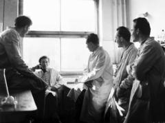 Veszprémi Vegyipari Egyetem (később Pannon Egyetem), középen dr. Polinszky Károly vegyészmérnök rektor, későbbi Kossuth-díjas, oktatáspolitikus ül az asztal sarkán.