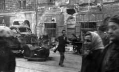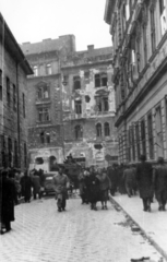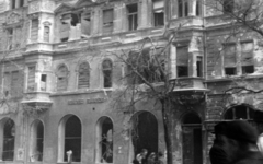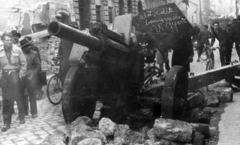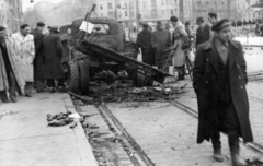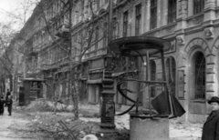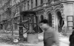Futó utca, kilőtt M30 típusú tarack a Práter utcai kereszteződés közelében, háttérben az Üllői út melletti épületek látszanak.