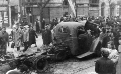 Balatoni út, a felvétel az Osztapenko szobor ledöntésekor készült, jobbra a háttérben a Budaörsi út házsora.
