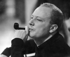 HÉV végállomás, a felvétel az Egy szerelem három éjszakája című film forgatásakor készült. Pipával Révész György a film rendezője.