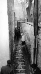 a Belgrád székesegyház melletti sikátor, Hunyadi utca (ekkor Avakumics köz), szemben a Templomdombi Iskola. A felvétel az Egy szerelem három éjszakája című film forgatásakor készült. Középen Révész György a film rendezője.