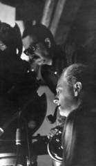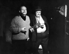 a felvétel Az oroszlán ugrani készül című magyar film forgatásakor készült, balra Révész György a film rendezője, jobbra Szendrő József színművész.
