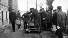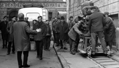 Futó utca, a felvétel az Egy szerelem három éjszakája című film forgatásakor készült. Balra Révész György a film rendezője, a kameránál Somló Tamás operatőr.