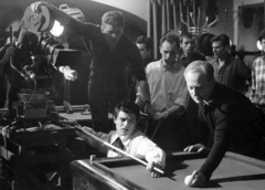 a felvétel az Egy szerelem három éjszakája című film forgatásakor készült. A billiárdasztalnál Sztankay István színművész guggol, pipával Révész György a film rendezője.