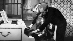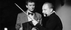 a felvétel az Egy szerelem három éjszakája című film forgatásakor készült. Szemben Tahi Tóth László színművész, dákóval és pipával Révész György a film rendezője.
