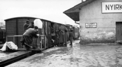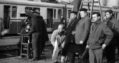 a felvétel az Egy szerelem három éjszakája című film forgatásakor a vasútállomáson készült. A vagon szélén esőkabátban Révész György a film rendezője áll.