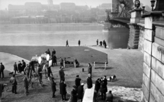 a Széchenyi Lánchíd pesti hídfője. A felvétel az Egy szerelem három éjszakája című film forgatásakor készült. A kameránál Somló Tamás operatőr, mögötte áll Révész György a film rendezője.