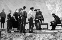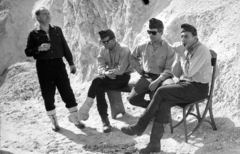 a felvétel az Egy szerelem három éjszakája című film forgatásakor a dolomitbányában készült. Balról a harmadik Révész György a film rendezője, a dobogón Tompa (Pufi) Sándor színművész, jobb szélen a széken Sinkovits Imre színművész ül.