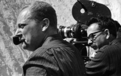 a felvétel az Egy szerelem három éjszakája című film forgatásakor készült. Szemben Somló Tamás operatőr, pipával Révész György a film rendezője.