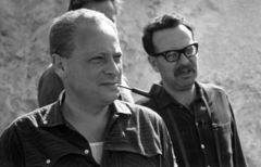 a felvétel az Egy szerelem három éjszakája című film forgatásakor a dolomitbányában készült. Pipával Révész György a film rendezője, mellette Somló Tamás operatőr áll.