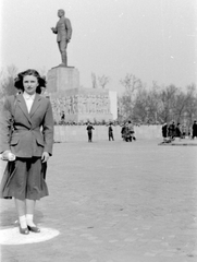 a mai Ötvenhatosok tere, háttérben Mikus Sándor szobrászművész alkotása a Sztálin szobor.