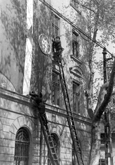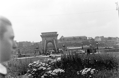 a felvétel a Széchenyi István (Roosevelt) téren készült, szemben a Széchenyi Lánchíd, jobbra távolabb a budai Várban a Várszínház és az egykori Karmelita kolostor épülete.